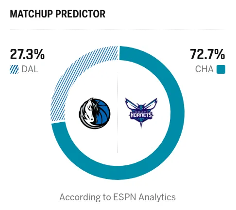 赛前,美媒ESPN预测本场比赛,独行侠胜率27.3%,黄蜂胜率72.7%。